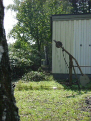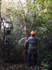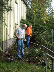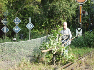 Zum Schutz des Fundaments wurden einige Bäume gefällt die direkt am Stellwerk standen. Ein großes Lob an den Mann an der Kettensäge. Durch sein Geschick sind alle Bäume dort hingefallen, wo sie keinen Schaden anrichten konnten. |