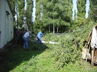 Zum Schutz des Fundaments wurden einige Bäume gefällt die direkt am Stellwerk standen. Ein großes Lob an den Mann an der Kettensäge. Durch sein Geschick sind alle Bäume dort hingefallen, wo sie keinen Schaden anrichten konnten. |